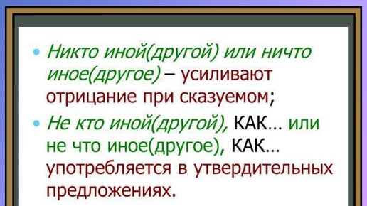 Как различать местоименные сочетания никто иной и не кто иной? Когда слитно, а когда раздельно? Когда ни, а когда не? Столько вопросов. Разобраться сложно, но можно. 1. Никто иной, ничто иное В предложении уже имеется отрицание, обычно есть глагол с частицей НЕ, может присутствовать оборот со словом КРОМЕ Никто иной, КРОМЕ тебя, НЕ сможет поговорить с ней. Ничто иное, кроме музыки, не интересовало брата. Здесь НИ пишется слитно, является приставкой. 2. Не кто иной, как… Не что иное, как… Пишем раздельно...