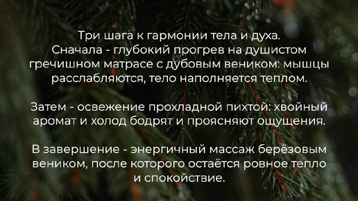 Только тепло дерева, приглушённый свет и тишина. Дыхание становится ровным, время замедляется, остаёшься наедине с собой.🍃 Профессиональный банщик, правильные веники, выверенная техника. Это не просто попариться - это терапия для тела и головы...