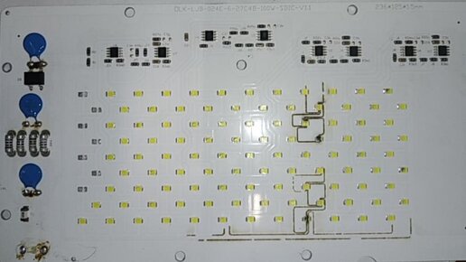На днях попались мне в руки два прожектора IEC СДО 07-100. У обоих не светится часть светодиодов. У первого часть дорожек на алюминиевой плате просто выгорело, поэтому решил не восстанавливать, а использовать его в качестве донора. Здесь невооруженным глазом все видно, 4 светодиода сгорели. При ближайшем рассмотрении оказалось, что драйверов 8 штук и распределены на восемь линеек светодиодов, причем в каждой линейке по 18 светодиодов. Через каждые 6 светодиодов в линейке есть отвод на драйвер. Лично я еще ни разу не встречался, а может и не обращал внимания, с такой схемой...