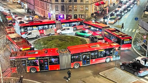 Тема выходного дня. Иногда пазл складывается там, где никто и не подразумевал, что вообще есть какие-то детали. В Осло, Норвегия четыре автобуса, честно шедшие по разным маршрутам, вдруг встретились в одной точке и сошлись в такой идеальный звёздный расклад, что теоретики вероятностей хлопнули бы в ладоши. Место оказалось прямо-таки феншуйным: красный транспортный мандала-оберег, собранный без репетиций. Но, как это обычно бывает, городская красота лучше смотрится сверху. Для обычных горожан на земле этот перфекционизм вышел не очень добрым...