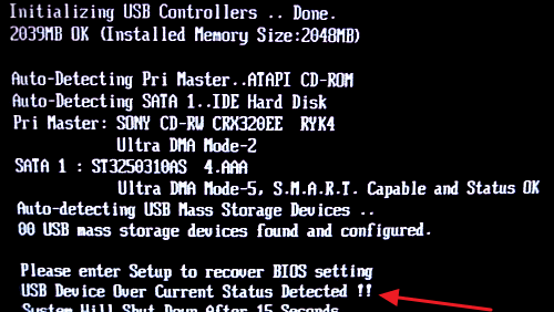 Сообщение "USB device over current status detected" при включении компьютера - как исправить