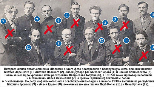 В ночь с 29 на 30 октября 1937 года в в минской тюрьме было расстреляно больше 100 представителей интеллигенции, из них 22 - представители литературы(поэты, прозаики, переводчики и критики) Среди убитых тогда были писатели Анатоль Вольный, Платон Головач, Алесь Дудар, Михась Зарецкий, Василь Коваль, Тодар Кляшторный, Моисей Кульбак, Юрка Лявонный, Янка Нёманский, Зяма Пивоваров, Василь Сташевский, Юлий Тавбин... И это только небольшая часть неповинных жертв, уничтоженных за годы сталинских репрессий...