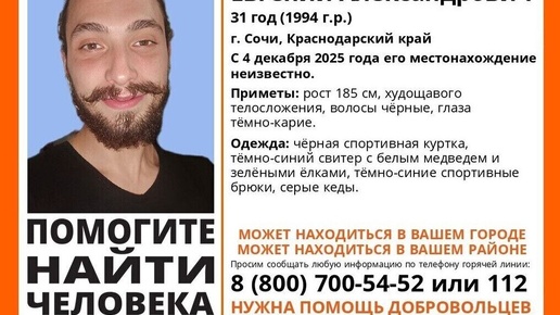 В Сочи разыскивают 31-летнего Евгения Докторовича. Как сообщили в телеграм-канале поискового отряда «ЛизаАлерт», его местонахождение неизвестно с 4 декабря 2025 года. Рост худощавого мужчины составляет 185 сантиметров, уточнили волонтеры. Они добавили, что у пропавшего чёрные волосы и тёмно-карие глаза. На момент исчезновения он был одет в тёмно-синий свитер с белым медведем и зелёными ёлками, чёрную спортивную куртку, тёмно-синие спортивные брюки и серые кеды...