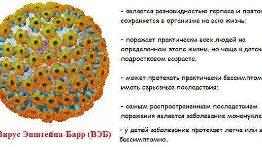 Вирус Эбштейн-Барр способен провоцировать разные виды инфекций, но в основном дети страдают мононуклеозом. Как подтвердить анализами данную инфекцию? К группе вирусов герпеса, наряду со всеми известными простым герпесом (простуда на губах), ветрянкой, розеолой или генитальным вариантом вируса, относятся также и некоторые другие. Всего известно 8 типов герпеса, опасных для детей, и 4-й тип – это вирус Эпштейн-Барр (ВЭБ), провокатор мононуклеоза, а при стечении особых обстоятельств – и многих более опасных патологий...