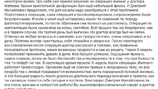 Новый отзыв!!! ☺️ Истории наших пациентов - это самый ценный отзыв и лучшая мотивация для нас, врачей. Сегодня хочу поделиться одним таким отзывом, которое особенно трогает своей искренностью. Это путь мужчины, который, как и многие, долго шел к принятию решения о фаллопротезировании. Сомнения, поиски, консультации - все это абсолютно нормально и понятно. Я всегда стараюсь относиться к таким сомнениям с уважением и максимально подробно все разъяснить. В этой истории для меня было важно несколько ключевых моментов, которые совпадают с моими принципами работы: 1...