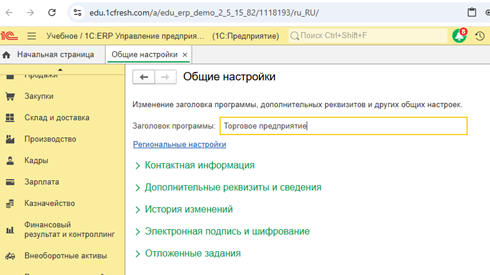 НСИ и администрирование – Настройка НСИ и разделов – Предприятие. Организации – Производственные календари Российская Федерация Год 2024 Посмотреть и закрыть. В системе необходимо выполнить настройки предприятия в соответствии со следующими условиями: Торговое предприятие "Учебное" состоит из двух юридических лиц. Проходим по пути: "НСИ и администрирование" – "Администрирование" – "Общие настройки" Далее переименовываем в «Учебное». Закрываем крестиком справа и получаем результат: Вместо того, что было: «Опт МСК Закупка»...