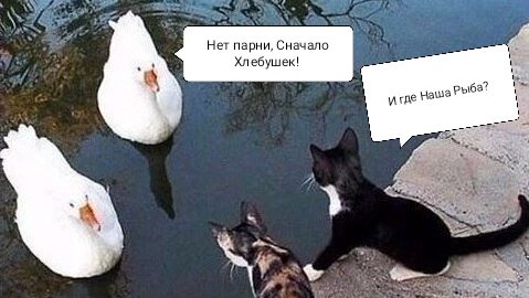 Ну что утки, Как житуха? Как делишки? То да сё Вы нам рыбу притащили!? Ведь мужской Был уговор, Ну во первых, мы не Утки ЛебедЯми, Нас Зовут Вы Коты уж не гоните Даш на Даш Был уговор, Пофиг, Утки или Гуси, Вы для нас одно Лицо Уговор Был Мы не спорим Но Про Что? О Чем? Какой? Вы мохнатые Нам Пели Кошкой Матерью клялись Что за Рыбу Вы готовы Хлеба булку притащить, Тут такое Дело, птицы. Хавчик Мы не принесли Что-то там с мукой проблемы Хлеб Ещё не Испекли...