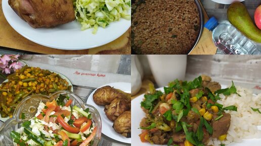 Моя постоянная рубрика с подборками завтраков, обедов и ужинов! #Обед 1 – тушу куриные ножки, просто с солью и перцем. И варю макароны твердых сортов пшеницы. Вот такие прикольные бантики от Макфы. Сверху лечо. #Обед 2 – отварной картофель - сливаю воду, в кастрюлю добавляю кусок сливочного масла, замороженный укроп и сушеный чеснок, накрываю крышкой и трясу все вместе. Котлеты из филе с шампиньонами на листьях салата. В чашу блендера, поэтапно. Сначала помытые шампиньоны, не до состояния каши, а пусть будут части покрупнее...