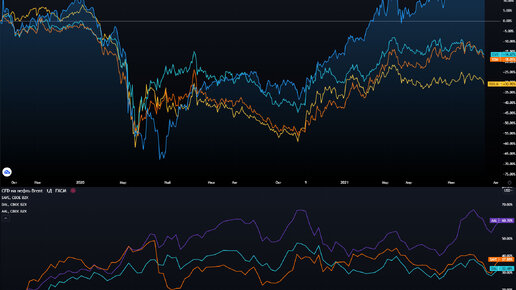 Разбираем Основы Простыми словами Корреляция — это взаимосвязь между несколькими инструментами. Когда одна величина растёт или уменьшается, другая тоже изменяется Пару примеров для наглядности Пример 1 Стоимость нефти коррелирует с котировками акций нефтедобытчиков Exxon $XOM, Chevron $CVX, Shell $RDS.A Нефть провалилась, нефтедобытчики упали, Нефть выросла, нефтедобытчики выросли. Всё просто и понятно. Взаимосвязь не всегда прямая, иногда графики идут в разные стороны (это называется Дивергенция (англ...