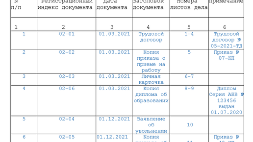 Внутренняя опись документов личного дела - образец