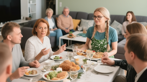 Анна поправила белоснежный фартук с вышитыми цветами — подарок от бабушки, который она берегла как реликвию, — и взглянула на старинные кухонные часы с кукушкой. До прихода гостей оставалось ровно четыре часа. Время, которое должно было быть наполнено радостью предвкушения, но вместо этого сжимало грудь тяжестью усталости. На плите томились щи — не просто щи, а те самые, по бабушкиному рецепту, с кислой капустой, которую она сама заквашивала осенью, с копчёностями из деревни и лавровым листом, собранным ещё в прошлом году...