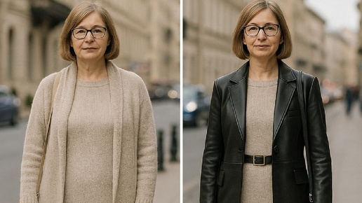 Всегда интересно смотреть на результат трудов профессионалов, буквально преображающих образ женщины внесением в них достаточно небольших изменений. 1. Бежевый трикотажный ансамбль из прямого лаконичного платья и такого же кардигана выглядит, конечно, женственно, однако его проблема в том, что трикотаж не слишком выгодно облегает фигуру, зачастую подчеркивая ее недостатки. А вот если дополнить платье черным кожаным ремнем, создающим акцент на талии, а от кардигана избавиться, заменив на стильный приталенный кожаный жакет черного цвета, образ будет производить совсем другое впечатление...