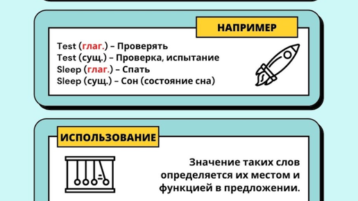 Или как одно слово может быть разными частями речи. Сегодня поговорим о том, как одно и тоже слово может означать сразу несколько значений В английском языке одна часть речи может быть образована от другой без изменения в произношении и написании. Например, test (сущ.) - испытание, проверка, test (глаг.) - испытывать проверять Sleep (глаг...