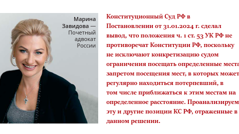 31 января 2014 г. Конституционный суд РФ вынес важное Постановление по вопросу конституционно-правого толкования содержания и применения ч. 1 ст. 53 УК РФ, регламентирующих один из видов уголовного наказания - ограничение свободы. Согласно этой норме ограничение свободы заключается в установлении судом осужденному ограниче. ний: не уходить из места постоянного проживания (пребывания) в определенное время суток, не посещать определенные места, расположенные в пределах территории соответствующего муниципального...