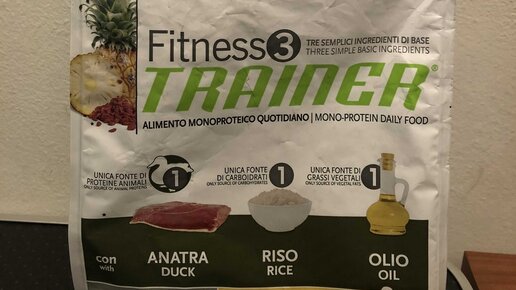 Сегодня гость нашего обзора - корм, произведенный в Италии. Знакомьтесь - Fitness Trainer 3. Было куплено два пакета. Один для взрослых, другой для щенков. На момент обзора остался только корм для взрослых собак. О нем и пойдет речь, но стоит отметить что разница между ними не особо существенная. Выглядит корм вот так Производится данный корм в Италии, однако упаковка русифицирована. Вот что пишет производитель: Корм походит для собак мелких пород склонных к пищевым аллергиям, проблемам желудочно-кишечного тракта или щенков с чувствительным пищеварением...