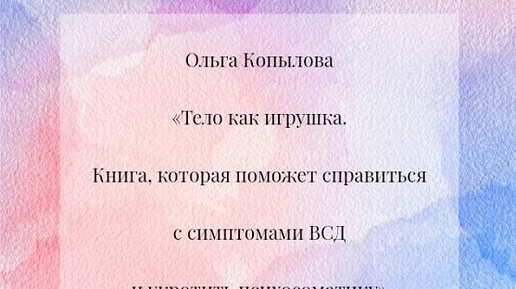 Ольга Копылова «Тело как игрушка. Книга, которая поможет справиться с симптомами ВСД, неврозом и укротить психосоматику». В книге рассказывается о том, как можно научиться управлять своим телом таким образом, чтобы психика не разрушала здоровье. ВСД и невроз — два термина, которые часто звучат рядом, хотя по сути описывают не столько болезнь, сколько способ реагирования организма на стресс. Многие люди, впервые столкнувшись с приступами учащённого сердцебиения, дрожью в руках, ощущением комка в горле или внезапной тревогой, начинают подозревать у себя «что-то серьёзное»...
