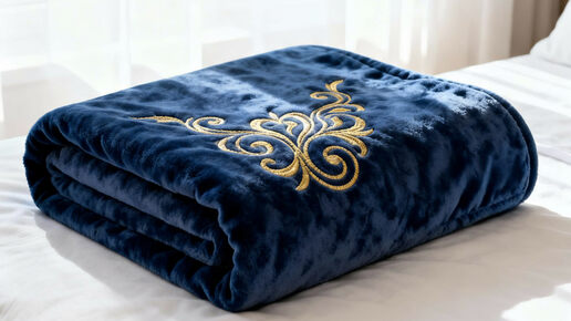 Плед с вышивкой в отеле - это не просто тёплая штука 🛌 Это момент, когда гость, едва зайдя в номер, разворачивает мягкий флис или пушистый велюр, чувствует текстуру узора под пальцами и ловит мысль: «Вау… какой приятный на ощупь, и так красиво» 💜 Мы любим работать с флисом плотностью от 250 г/м² (тонкий просто «съедается» стежками), с уютным махром и роскошным велюром, где золотая нить на индиго играет при свете. Размер логотипа обычно 7–12 см, без лишних деталей, максимум три цвета...