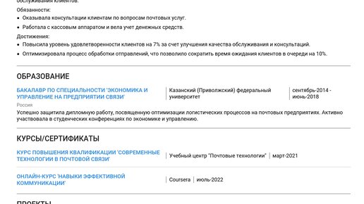Пример резюме оператора почтовой связи 2025 - готовый пример
