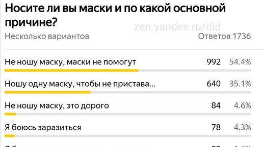 Две с половиной недели назад я опубликовала опрос о причинах, побуждающих людей носить маски. С тех пор многое изменилось: масочный режим ввели в большинстве регионов России, в некоторых местах ещё и перчаточный режим, в каких-то случаях есть послабления, где-то наоборот. На опрос за это время ответили 1736 человек. Спасибо вам за отзывчивость и откровенность. Опрос был анонимный, поэтому результат, как мне кажется, очень близок к истине. Я проверяла ответы каждый день, потому что думала, что результаты будут отличаться в зависимости от ужесточения требований...