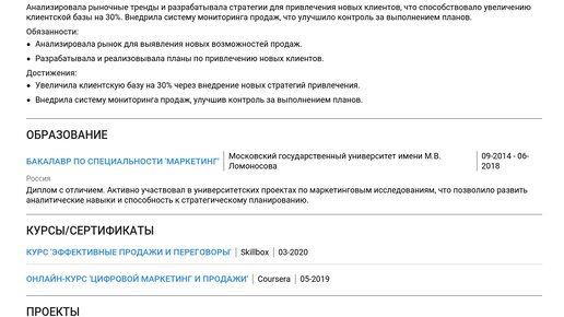 Изучите наш подробный пример резюме менеджера по продажам ТНП, чтобы создать свое эффективное резюме. Правильно составленный документ — ваш первый шаг к получению желаемой работы. 💡 В статье вы найдете готовый пример резюме менеджера по продажам ТНП с пошаговыми инструкциями, как составить эффективный документ для начинающих и опытных специалистов. Мы подробно разбираем, как: . Изучив пример, вы сможете создать резюме с помощью нашего конструктора резюме. Заголовок должен четко отражать вашу специализацию и уровень профессионализма...
