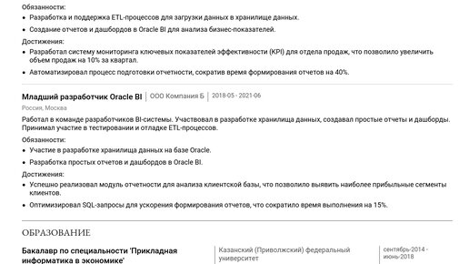 Изучите наш пример резюме разработчика Oracle BI 📄, чтобы понять, как составить эффективную самопрезентацию. Это ваш ключ к успешному поиску работы. Здесь вы найдете все необходимое, чтобы создать идеальное резюме, будь вы начинающий или опытный специалист. Мы предлагаем готовые примеры резюме для разных уровней, для каждого раздела. Изучив пример, вы сможете создать резюме с помощью нашего конструктора резюме. Следуйте нашим рекомендациям, и ваше резюме выделится среди других. Заголовок резюме – это первое, что видит рекрутер...