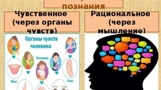 Органы чувств (глаз, ухо, кожа, язык, нос) служат для восприятия окружающего мира и внутреннего состояния организма. Чувственное познание осуществляется в трёх формах: ощущениях, восприятиях, представлениях. Ощущение – это наиболее элементарная форма чувственного познания. Восприятие есть целостный образ, состоящий из нескольких ощущений. Представление – образ ранее воспринятого или созданного воображением явления. Представления возникают на основе припоминания или же воображения, часто они относятся к прошлому и будущему...