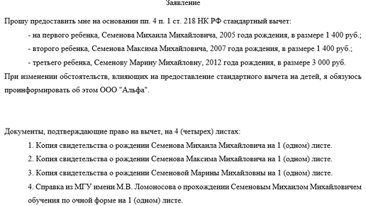 Стандартный вычет на ребенка - заявление Вычет по НДФЛ – это та часть заработка, на которую не начисляется подоходный налог. Если у работника есть дети, то на каждого из них полагается вычет в определенном размере. Размер уменьшения налоговой базы зависит от того, сколько в семье детей, нет ли среди них детей-инвалидов, а также, кем для них является получатель вычета: родителем, усыновителем, опекуном и т.д. Если родитель признан единственным, или второй из родителей от вычета отказался, размер «детского» вычета будет в два раза больше...