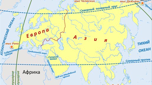 Евразия почти целиком расположена в Северном полушарии. Ряд островов к юго-востоку от материка расположен в Южном полушарии. Из-за большой вытянутости с севера на юг (8000 км) на материке распространены все географические пояса (от арктического до экваториального). Из-за огромной протяжённости с запада на восток (16000 км) Евразия занимает всё Восточное полушарие, а её крайние западная и восточная точки находятся в Западном полушарии. Крайняя северная точка Евразии — мыс Челюскин (77° с. ш.), крайняя южная точка — мыс Пиай (1° с...