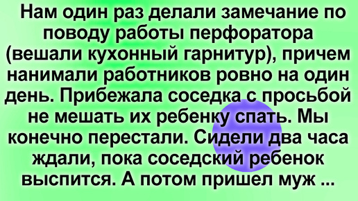 История 1 Тут наверное от человека зависит как себя вести. Мне например не приходилось делать кому либо замечание по какому- либо поводу. Ни чьи шумы нас не раздражали, да их объективно и не было. Нам один раз делали замечание по поводу работы перфоратора ( вешали кухонный гарнитур), причем нанимали работников ровно на один день. Прибежала соседка с просьбой не мешать из ребенку спать. Мы конечно перестали. Сидели два часа ждали, пока соседский ребенок выспится. Ну и заплатила я из своего кармана за простой...