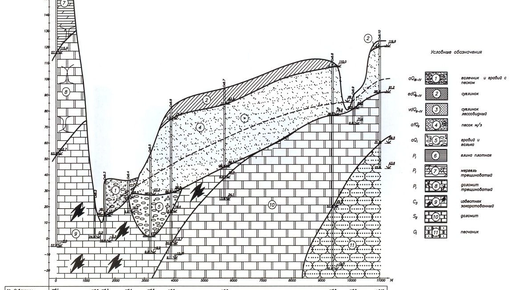 После выбора масштаба чертежа (приложение ) и нанесения на лист таблицы с вертикальной высотной координационной рейкой приступают к вычерчиванию геологического разреза. 1. Наносится поверхность земли по характерным точкам, описанным в данных для построения топографических профилей. Для этого на начерченной координатной основе по горизонтали откладываются расстояния между точками топографического профиля, а по вертикали их абсолютные отметки. Полученные точки профиля соединяются от руки плавной линией...