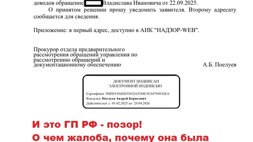 Разбор полетов: как одно мое письмо вскрыло системные проблемы в работе надзорного ведомства. Отписка от Поелуева