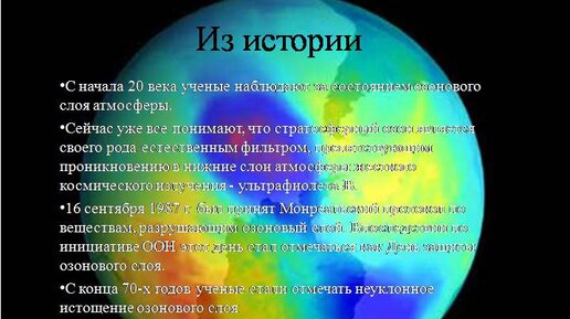 Основные экраны располагается между трапосферой и стратосферой и защитает не поверхность Земли от жостких ультрафиолетовых излучений,губитльного для всего живого.В озоновом экране находится озон имеет определенное значение,уменьшая концентрацию озона снижая эффект его положительного воздействия. В последнее время появилось "Озоновые дыры" было обнаружено на Северном и Южном полюсом Земли , причем ,втарая "Дыры"по размеру значительно превышает первую. Над Антарктидой площадь "Озоновой Дыры"составляет 22 млн...
