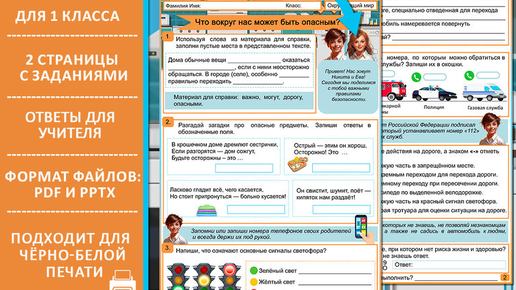 Рабочий лист состоит из 7 заданий по теме «Что вокруг нас может быть опасным?». Разработан специально к уроку "Окружающий мир" в 1 классе (УМК «Школа России»). Отдельная страница отведена под ответы для учителя. Уникальность данного рабочего листа заключается в присутствии персонажей – первоклассников Евы и Никиты, которые поделятся с ребятами важными правилами безопасности. Список заданий (кратко): Задание 1. Используя слова из материала для справки ... Задание 2. Разгадай загадки про опасные предметы ...