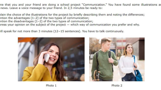 (Говори медленно, как в голосовом сообщении, и не останавливайся. Длина: около 13 предложений, около 2,5 минут.) Hi there! I wanted to send you the photos for our project "Communication", but I have technical problems. So, I’ll explain them in this voice message. These pictures are relevant to our project because they both show people talking to someone. The first photo shows a girl talking on the phone with a smile on her face. It represents personal communication. The second photo shows a boy and a girl talking face-to-face outside...