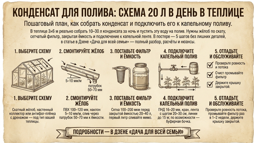 Готовое решение для теплицы 3×6 м такое: ставим ПВХ-жёлоб по внутреннему краю ската, делаем слив конденсата через сетчатый фильтр 100–200 мкм в закрытую ёмкость 20–40 л и оттуда подключаем капельную ленту через ПНД-трубу 16–20 мм. При ночном перепаде температур 10–15 °C это даёт 10–30 л в сутки, 20 л в день достижимы без экзотики. Альтернативы под задачу: гидрофильная антифог-плёнка с периферийным дренажом или настенный коллектор. Ключевое требование одно — собрать воду до падения капель на листья, иначе конденсат нарастит грибные болезни...