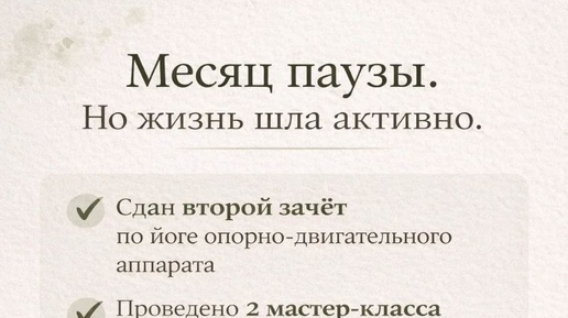 Последний пост был почти месяц назад 😏 И, честно говоря, за это время появлялась мысль… а может просто не писать больше? Не делиться, не вести канал. Кажется, что тишина — проще. Ничего не объяснять, не формулировать, не выкладывать в пространство свои мысли и опыт. Но жизнь за этот месяц шла очень живо: ✅Сдала второй зачёт по йоге опорно-двигательного аппарата — это глубокая и важная для меня тема. Чем больше изучаю тело, тем яснее понимаю: здоровье строится не на усилии, а на точном понимании, как всё устроено...