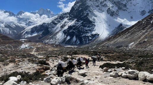 Подъём на перевал издали впечатляет и наводит ужас. На самом деле, ничего сложного. Вернее, как. Чисто по расстоянию - меньше километра и 200 метров набора высоты. Но всё это происходит на высоте от 4650 до 4850 метров. Что, согласитесь, высоко. Поэтому многих начинает накрывать. У кого голова начинает болеть, у кого живот, а кто до этого быстро бежал, тот окончательно всё силы растерял. Мы же медленно и верно ползли на перевал. Перед нами шли портеры, которые несли огромные фанерные листы...