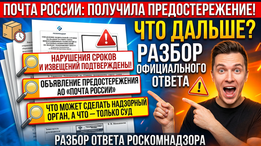 Роскомнадзор признал нарушения Почты России: предостережение и что это значит Как Роскомнадзор проверил Почту России и вынес предостережение Ответ Роскомнадзора: нарушения сроков пересылки и извещения подтверждены Почта России нарушила сроки пересылки. Что ответил Роскомнадзор? Предостережение Роскомнадзора: что это за мера и как она работает? Нарушения Почты России: что может сделать надзорный орган, а что - только суд? Моя жалоба в Роскомнадзор: итоги проверки и объявленное предостережение Почта России получила предостережение...