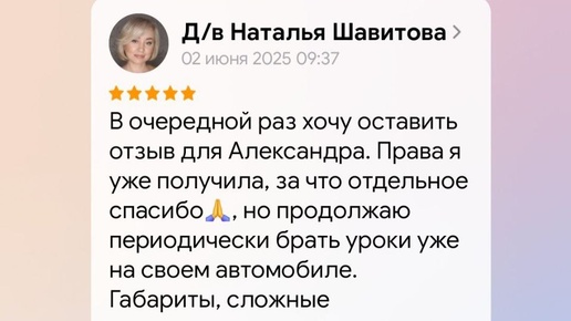 Наталья, огромное спасибо за такой душевный и ценный отзыв! Для меня, как вашего персонального автоинструктора, это лучшая мотивация — видеть, как вы, получив права, осознанно продолжаете путь к мастерству именно со мной. Ваша история, Наталья, — яркий пример, почему ученики ко мне возвращаются: 1️⃣ От прав — к уверенности! Вы не остановились на экзамене. Вы инвестируете в свою безопасность и комфорт в реальности: сложные перекрестки, тесная парковка, трасса в дождь. Это и есть настоящий результат нашей работы...
