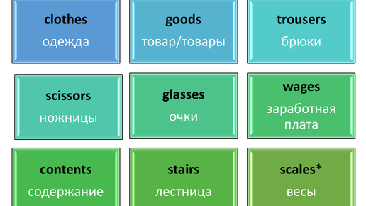 Сегодня рассмотрим группу существительных, которые имеют форму множественного числа. Часто эти особенности не учитываются, потому что в русском языке эти же слова могут иметь как форму единственного числа, так и форму множественного числа. Например, слово «товар-товары» на английском будет звучать как «goods», и оно имеет только форму множественного числа. These goods are of poor quality. – Эти товары плохого качества. Ниже предлагаю вашему вниманию список слов, которые употребляются только во множественном числе...