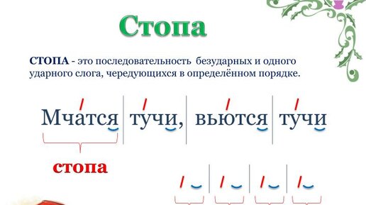 Стопа в стихосложении представляет собой минимальную ритмическую единицу стиха, повторяющуюся комбинацию ударных и безударных слогов. Понимание системы стоп необходимо для анализа поэтического ритма и особенностей стихотворной речи. В русском стихосложении выделяют несколько основных видов стоп, каждая из которых создает особую мелодику стиха. 1. Двусложные стопы: - Хорей(-́◡) - ударение падает на первый слог ("бу́ря мгло́ю не́бо кро́ет"). - Ямб (◡-́) - ударение на втором слоге ("люблю́ тебя́, Петра́ творенье")...