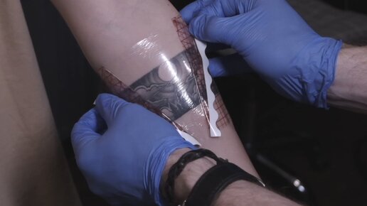 1. Начните смачивать пленку теплой водой, чтобы она стала более мягкой и легче отделялась от кожи. 2. Осторожно поднимите уголок пленки и начинайте ее медленно отделять, при этом не рвите ее резко. 3. Если вы заметили, что на поверхности татуировки образовалось скопление жидкости или крови - немедленно прекратите процесс удаления пленки и промокните это место салфеткой или губкой. 4. После полного удаления защитной пленки осмотритесь: если на поверхности татуировки есть какие-то загрязнения (пыль, грязь), то очистить нужно спиртом или другим асептическим средством для дезинфекции кожи перед нанесением нового слоя защитной пластыри...