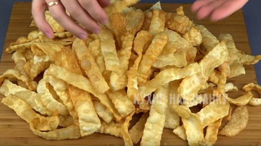 Хрустящий и очень вкусный! Таким и должен быть этот десерт. Вкус точно из детства, так еще моя бабушка готовила. Никогда не добавляли в тесто для хвороста ни уксус, ни водку. И я считаю эти лишним)) Как я готовлю такой хворост, смотрите в видео ниже на 11:49. Там же еще 4 очень простых и очень бюджетных рецепта - пирожки на картофельном отваре, вкуснейшая икра из моркови и селедки, лепешки с луком практически из ничего и драники. Посмотрите - вам понравится)) Ингредиенты: • Яйцо - 2 шт. • Мука -...