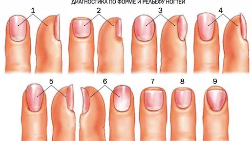 Рассмотрите свои ногти на руках, форма и рельеф и поверхность ногтевой пластины. 1- абсолютно здоровая ногтевая пластина, говорящая о хорошем состоянии здоровья человека. 2 – ноготь укороченный и плоский (заболевания сердца и сосудов). 3 – выпуклый, утолщённый ноготь (проблемы с сердцем, позвоночником, лёгкими или с печенью). 4 – плоский ноготь с искривлённой поверхностью (заболевания дыхательной системы). 5 – ноготь похож на трубку (возможно онкологическое заболевание). 6 – вогнутость внутрь...