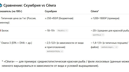 🧠 Что это значит — по факту ✅ Белок — почти одинаков: и скумбрия, и сёмга дают около 18–20 г белка на 100 г. То есть с точки зрения белка скумбрия ничем не хуже. 🐟 Омега‑3 — по данным некоторых источников, скумбрия может давать даже больше омега‑3, чем сёмга. АиФ +2 NV +2 💸 Цена — скумбрия заметно дешевле. То есть по «цена / белок / полезные жиры» она в ряде случаев выигрывает. 🍽 Для обычного человека, ведущего активный образ жизни (как ты — с учёбой, работой, стремлением быть «ресурсной»), скумбрия — выгодный, разумный выбор...
