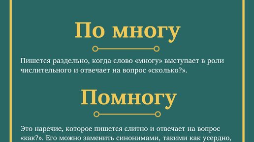 🗣️ Правильное употребление «По многу» пишется раздельно, когда слово «многу» выступает в роли числительного и отвечает на вопрос «сколько?» Мы не видим его дома по многу месяцев. «По много» также является синонимом «по многу» и может использоваться в том же значении, если это делает фразу более звучной...
