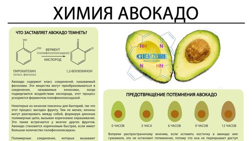 В нашем очередном переводе зарубежной инфографики описаны причины потемнения авокадо и способы борьбы с этим явлением. Мы также рекомендуем к прочтению наши переводы зарубежной инфографики: - Химия рома - Химия вишни - Запах мусора - Химия тюльпанов и "тюльпановые пальцы" - Подснежники, Альцгеймер и химическое оружие - Химия имбиря - Как снимают отпечатки пальцев Также мы советуем почитать нашу серию постов об укоренившихся в народе мифах, которые мы развенчали: - Изобретение водки...