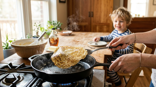 Было воскресенье, девять утра. Сын пришёл на кухню в пижаме, сел на табуретку и сказал: «Блины». Не «доброе утро», не «мам, привет» — просто «блины». Я достала миску. Знакомо? Когда ты стоишь с половником, сковорода шипит, ты наливаешь — и тесто намертво приклеивается ко дну. Ты поддеваешь лопаткой — рвётся. Ещё раз — рвётся. Ты злишься, льёшь масла побольше, наливаешь следующий — и он тоже рвётся. Сын смотрит. Молча. Мне написали в комментариях: «Скажите честно — почему блины прилипают? У меня новая сковорода, хороший рецепт, всё по инструкции...