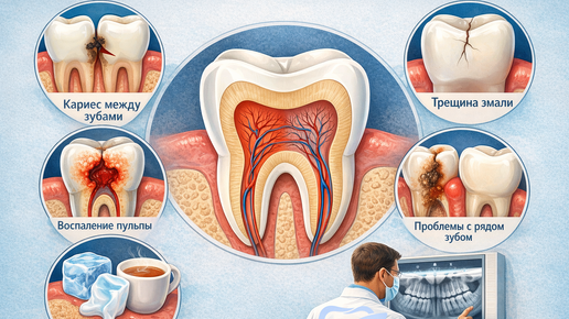 Знакомая ситуация: зуб ноет, болит на холодное или горячее, а вы смотрите в зеркало — и ничего не видите. Никакой очевидной «дырки», никакого потемнения. «Может, само пройдёт?» — думаете вы. Не пройдёт. И вот почему. То, что мы видим в зеркале — лишь внешняя оболочка. Внутри каждого зуба находится живая ткань: пульпа с нервами и сосудами, корни, уходящие глубоко в челюсть. Боль может возникать на любом из этих уровней — и большинство из них снаружи просто не видно. 1. Кариес между зубами