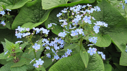 Бруннера (Brunnera) или незабудочник – беспроблемный зимостойкий травянистый многолетник для тенистого сада семейства Бурачниковых (Boraginaceae). У бруннеры крупные морщинистые, шершавые на ощупь, сердцевидные заостренные листья. Темно-голубые цветки, похожие на цветки незабудки только крупнее и с белым глазком, собраны в рыхлые метельчатые или щитковидные соцветия. На одном месте может расти до 10-15 лет. Зимует в Подмосковье прекрасно. Бруннера цветет в мае-июне около месяца. Это агрессивный многолетник, даже маленький кусочек корневища укореняется и растет без проблем...